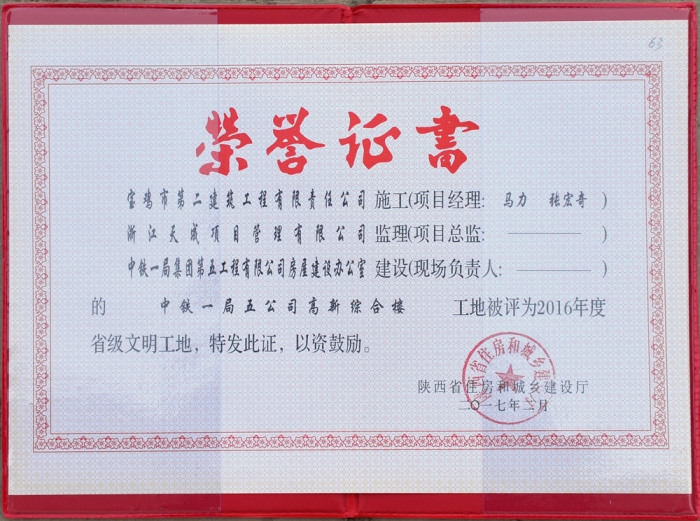2017年度省級文明工地(鐵一局五公司綜合樓)