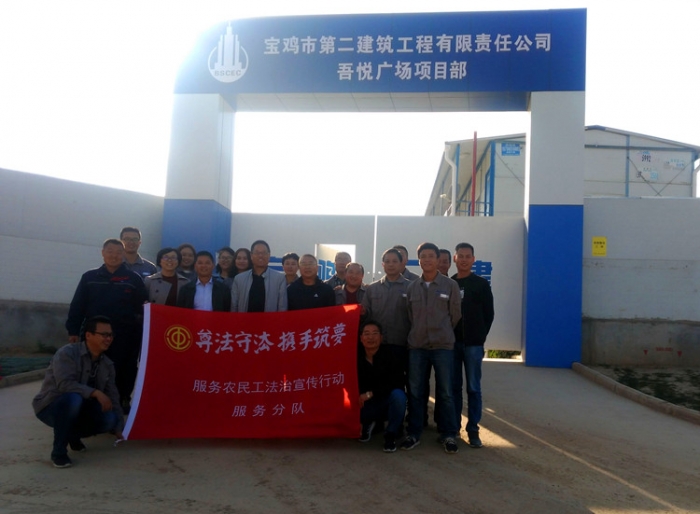 2018年10月10日下午,寶雞文理學(xué)院服務(wù)農(nóng)民工法治宣傳服務(wù)分隊(duì)來到公司吾悅廣場(chǎng)項(xiàng)目施工現(xiàn)場(chǎng),舉辦了一場(chǎng)“尊法守法·攜手筑夢(mèng)”法律知識(shí)公益講座。第三十項(xiàng)目部、第三十八項(xiàng)目部的三十余名現(xiàn)場(chǎng)施工人員參加了活動(dòng)。