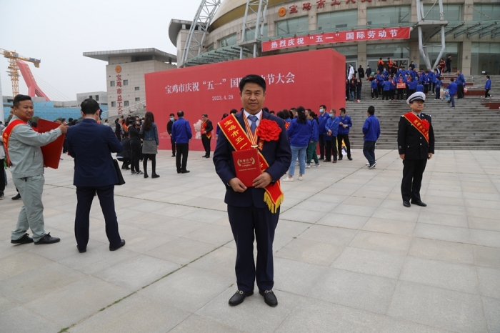 4月28日,在寶雞市慶?!拔逡弧眹H勞動節(jié)大會上,集團公司李紅軍同志被寶雞總工會授予五一勞動獎章,并上臺領獎。(左三)