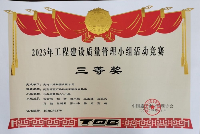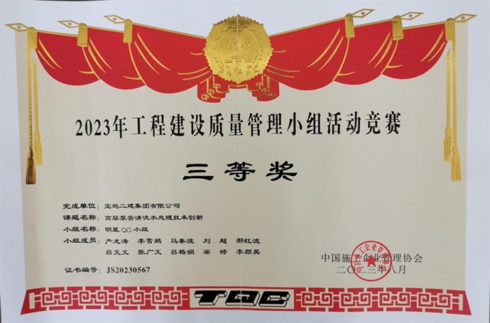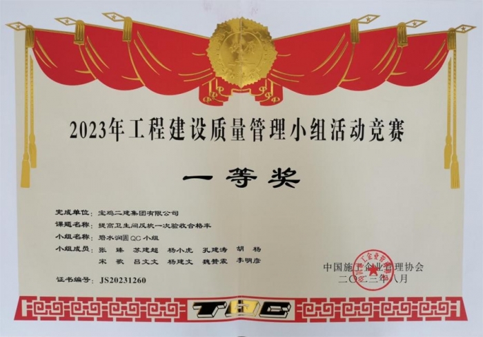 最終,碧水潤(rùn)園QC小組“提高衛(wèi)生間反坎一次驗(yàn)收合格率”榮獲2023年工程建設(shè)質(zhì)量管理小組活動(dòng)競(jìng)賽一等獎(jiǎng),技術(shù)質(zhì)量部QC小組“提高屋面廣場(chǎng)磚施工驗(yàn)收合格率”榮獲2023年工程建設(shè)質(zhì)量管理小組活動(dòng)競(jìng)賽三等獎(jiǎng),明星QC小組“高層泵管清洗水處理技術(shù)創(chuàng)新”榮獲2023年工程建設(shè)質(zhì)量管理小組活動(dòng)競(jìng)賽三等獎(jiǎng)。